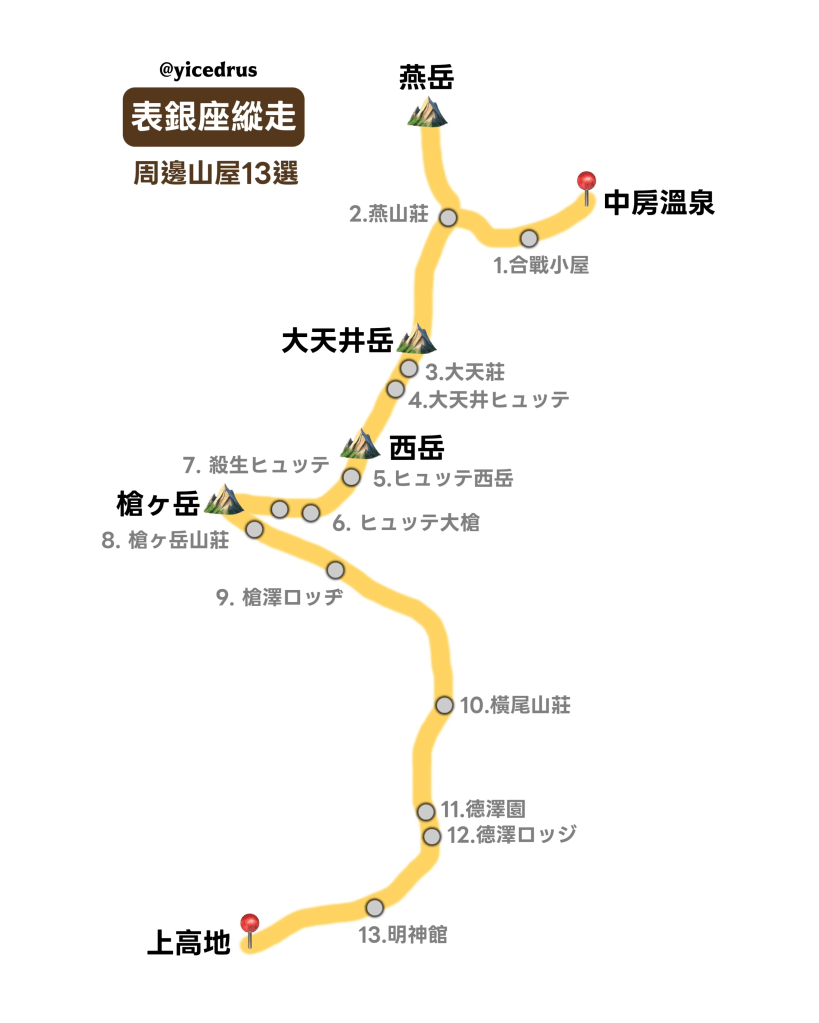 表銀座縱走周邊山屋總計共13 間,眾多山屋,能符合不同腳程和體能程度的登山者,以下按照地理位置順序介紹。