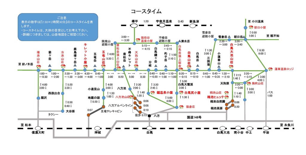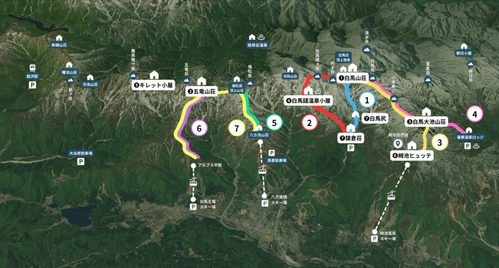 最熱門的是白馬三山路線,由3座山岳組成,白馬岳、杓子岳、白馬鑓ヶ岳,基本安排為 路線3(鵝黃線)-白馬岳-路線2(紅線),可右上左下,亦能反過來。