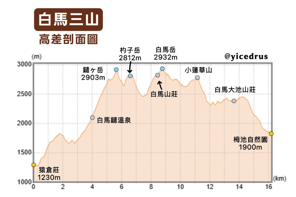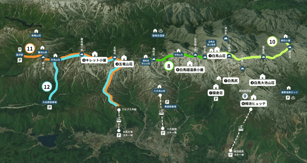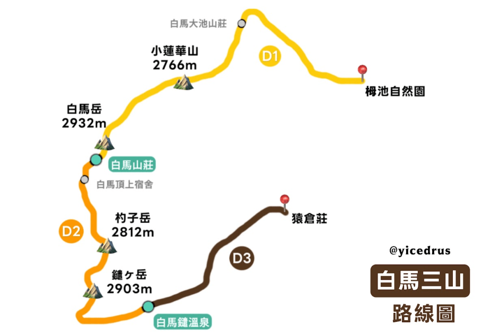 - 4天3夜 :D1 白馬大池山莊、D2 二選一 (白馬山莊 / 白馬頂上)、D3 白馬鑓溫泉