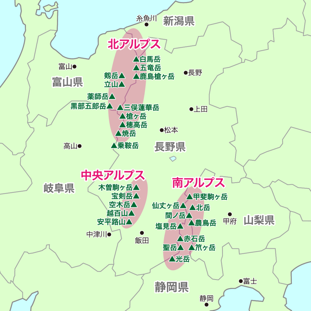 由北至南主要的山岳,為朝日岳、雪倉岳、白馬岳、唐松岳、五竜岳、鹿島槍ヶ岳、爺ヶ岳、以及針ノ木岳,體能OK者可串連一起完成。
