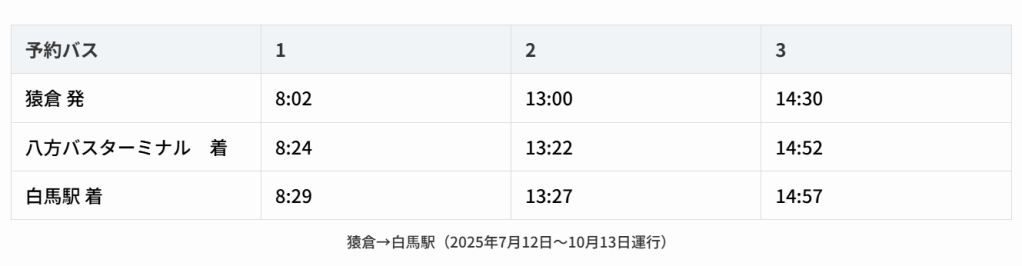 3個班次,直達白馬站,30分鐘車程時間,票價¥2000=$400台幣,猿倉發車上午8:02、下午13:00、14:30,實際時間洽猿倉-白馬 巴士官網,巴士預約網站。
