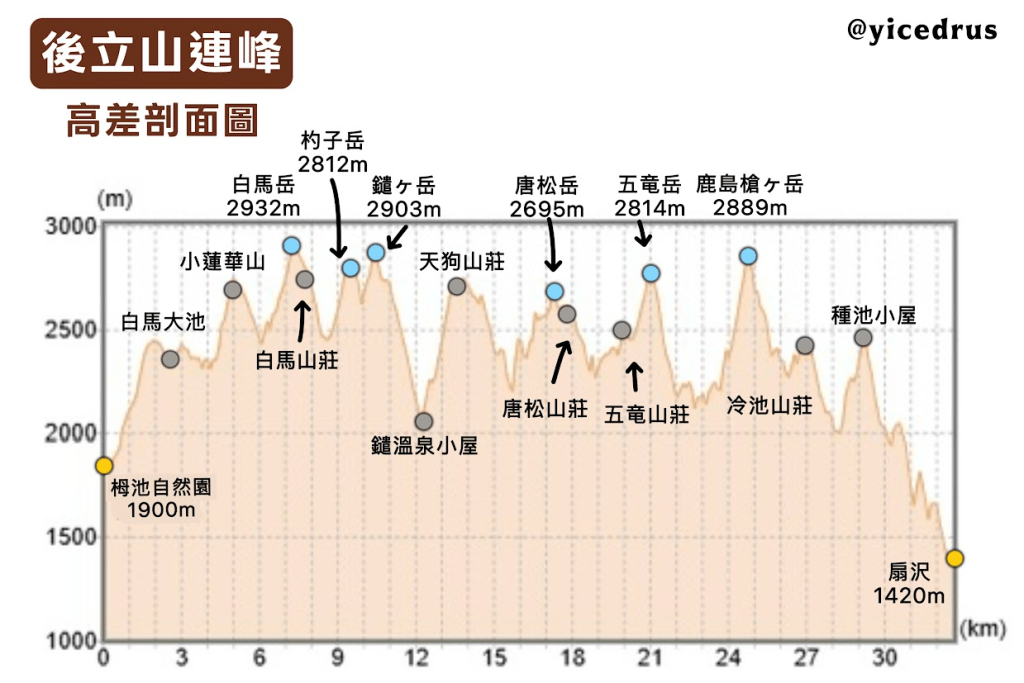 - 後立山連峰 5天4夜:D1 二選一(白馬山莊 / 白馬頂上),D2唐松山莊,D3五竜山莊,D4冷池山莊